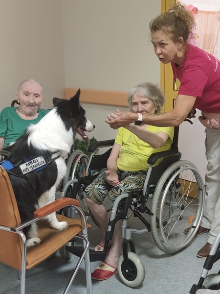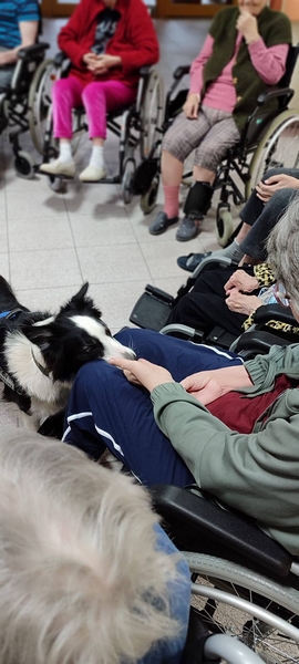 16.05.2024 r. – DOGOTERAPIA. Cyklicznie co drugi tydzień gościmy w Naszym Domu pieski. Dzisiaj jest ten dzień, przytulania i głaskania nie ma końca. Pani Wiola potrafi tak pracować z pupilami, że podziwiamy sztuczki, obroty, podawanie łapy. Bardzo przyjemne są te zajęcia.